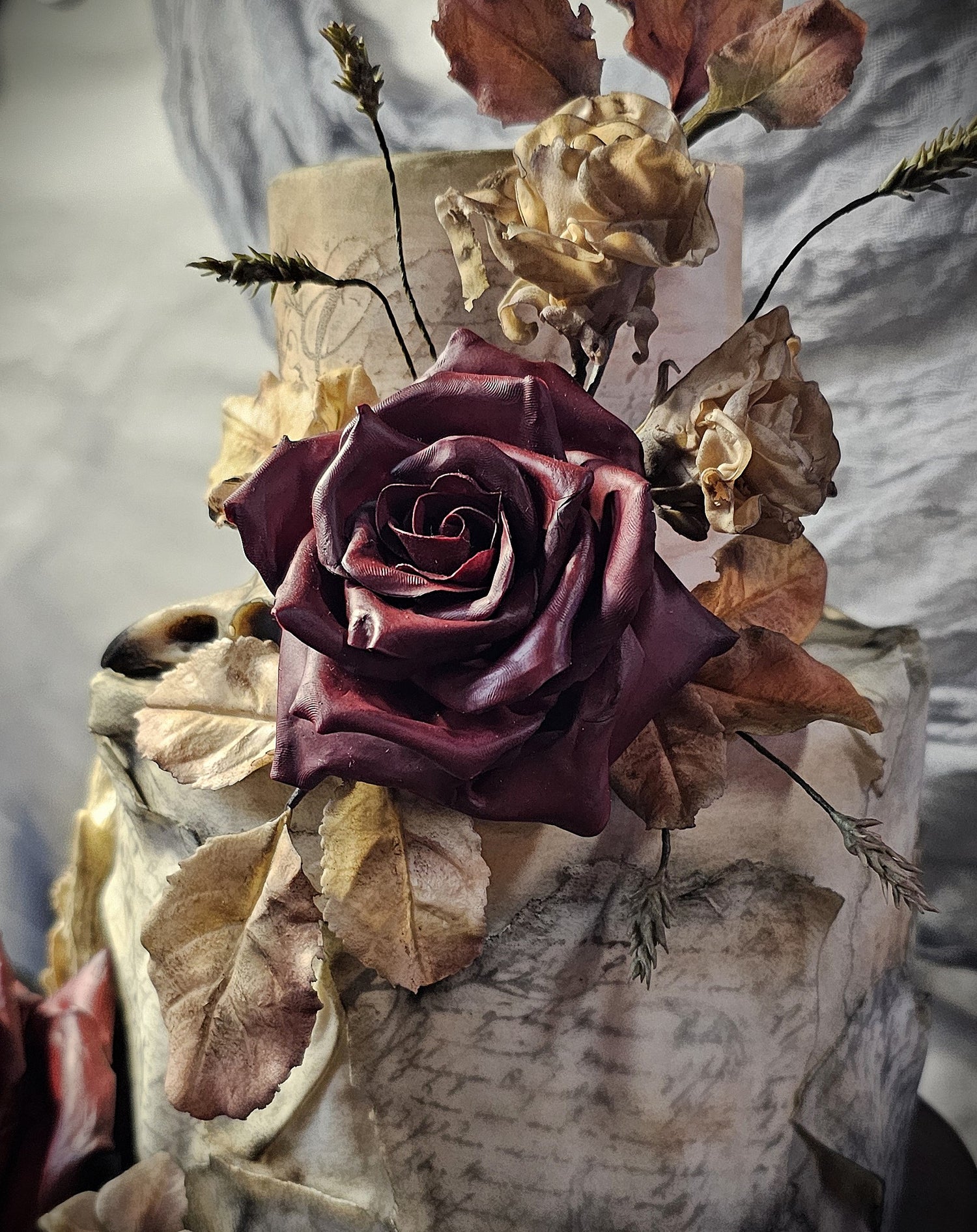 With it's matt black fondant and a cameo of vintage crimson and black highlighted with sculpted sugar florals, this cake could have been plucked from a candlelit drawing room in a long forgotten manor.